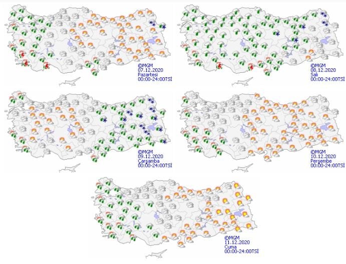 Meteoroloji Genel Müdürlüğü tarafından yapılan son değerlendirmelere göre: Ülkemiz genelinin parçalı ve çok bulutlu, Marmara, Ege, Akdeniz ve Batı Karadeniz ile Ankara, Eskişehir, Konya ve Malatya çevrelerinin yağmur ve sağanak yağışlı, Kars ve Iğdır çevrelerinin ise karla karışık yağmur ve hafif kar yağışlı geçeceği tahmin edilmektedir. Yağışların öğle saatlerinden sonra Muğla ve Antalya ile Aydın'ın kıyı kesimlerinde yer yer kuvvetli sağanak ve gök gürültülü sağanak şeklinde olması bekleniyor. İç kesimlerde sabah erken saatlerde buzlanma ve don olayı ile birlikte pus ve yer yer sis görülmesi bekleniyor.