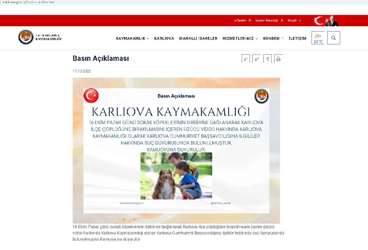Kaymakamlığın sosyal medya hesabından yapılan paylaşımda, "16 Ekim Pazar günü, sokak köpeklerinin birbirine bağlanarak Karlıova ilçe çöplüğüne bırakılmasını içeren üzücü video hakkında Karlıova Kaymakamlığı olarak Cumhuriyet Başsavcılığı'na ilgililer hakkında suç duyurusunda bulunulmuştur" ifadelerine yer verildi.