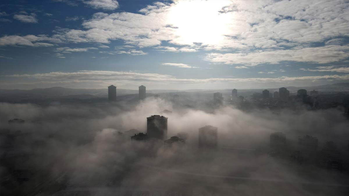 Bazı bölgelerde tabana çöken sis nedeniyle binalar kısmen sis altında kaldı.