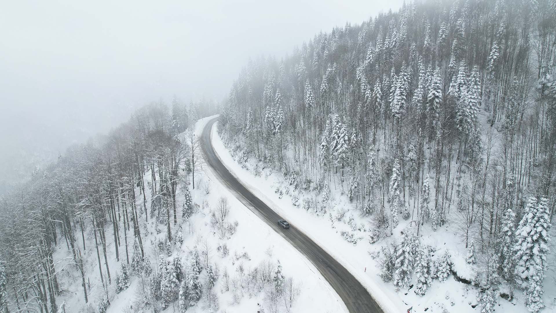 Yol güzergahı üzerinde kalan, zaman zaman sisin de etkili olduğu karla kaplı ormanlık alanlarda ortaya çıkan manzara dron ile görüntülendi.
