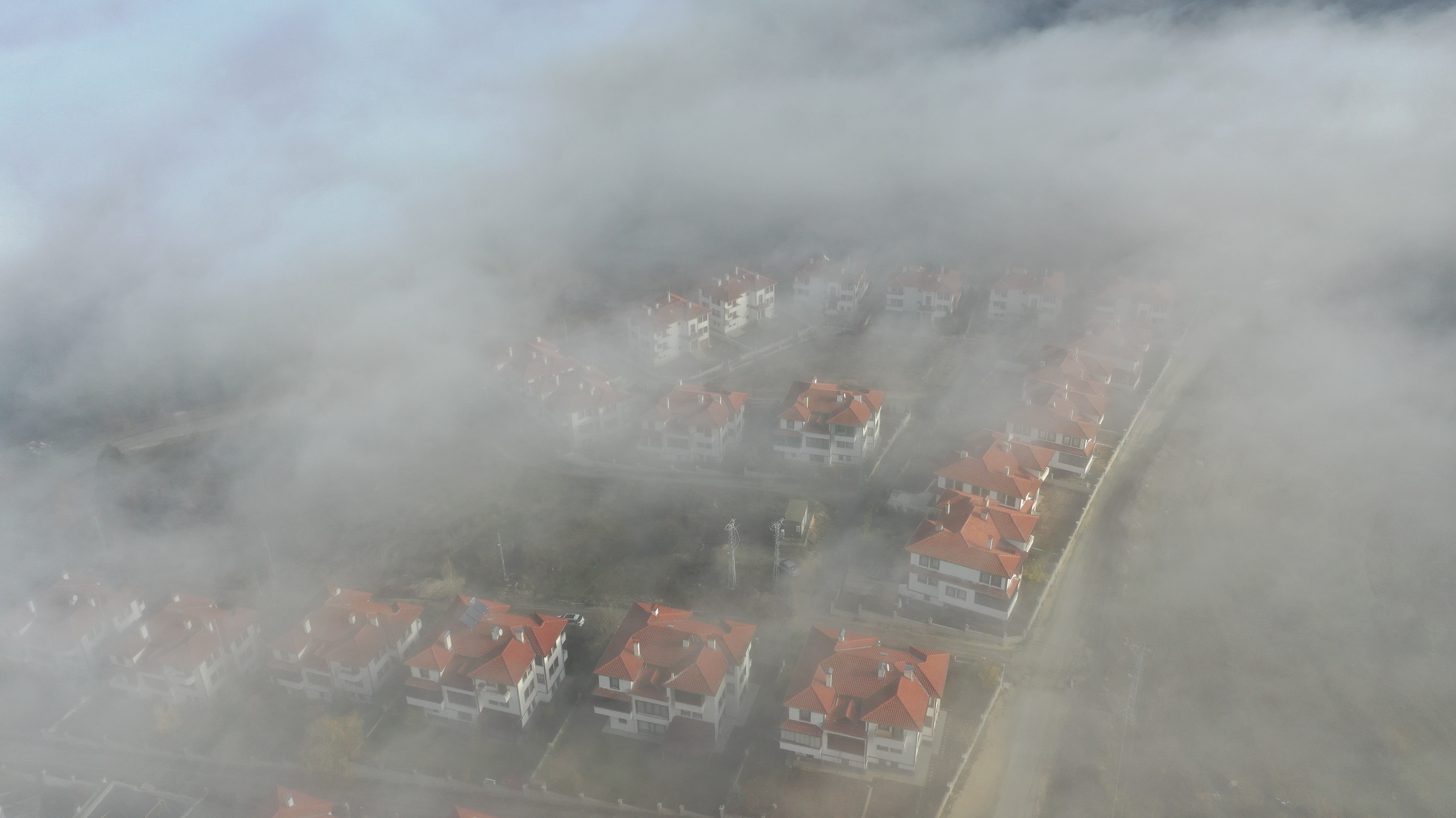 Sis bulutuyla bütünleşen manzara, dronla görüntülendi.