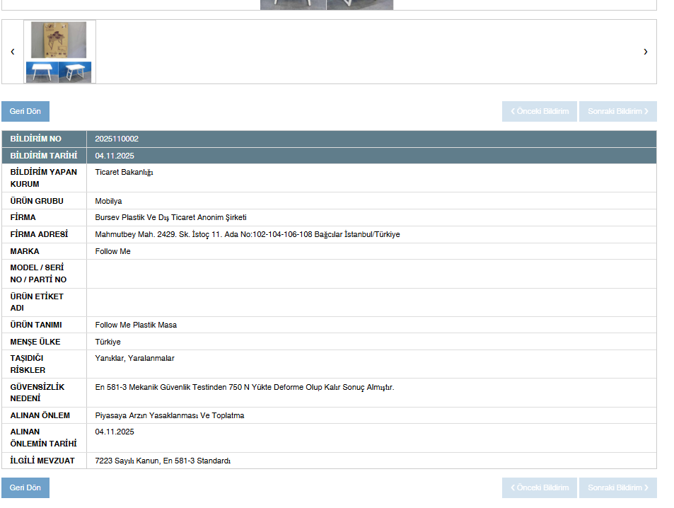 Bakanlık verilerine göre, Bursev Plastik ve Dış Ticaret A.Ş. tarafından üretilen masa, EN 581-3 mekanik güvenlik testinde 750 N yükte deformasyon gösterdi. Bu durum, ürünün standartlara uygun olmadığını ortaya koydu. Test sonuçlarına göre masa, kullanıcıya zarar verebilecek ölçüde dayanıksız bulundu.