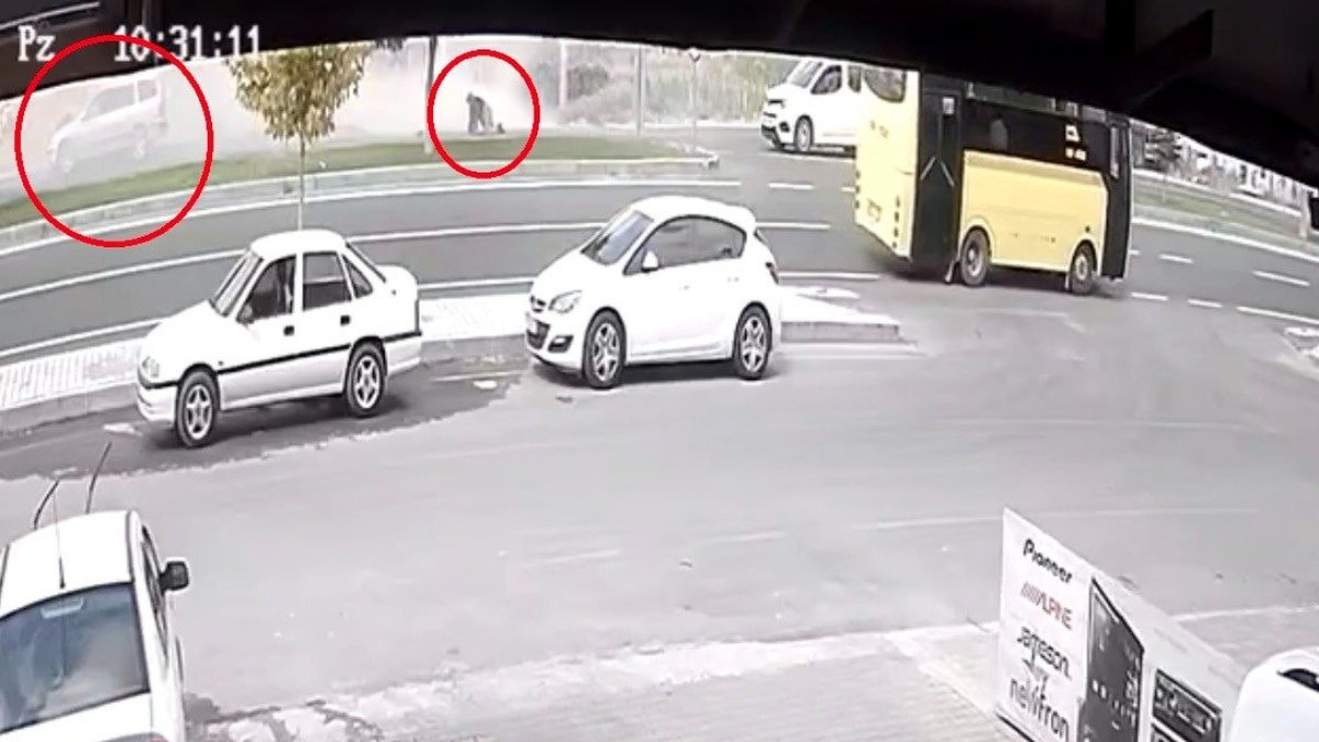 Kadın, düştüğü yolda olayın etkisiyle ayağa kalktı. O anlar güvenlik kamerası tarafından kaydedildi.