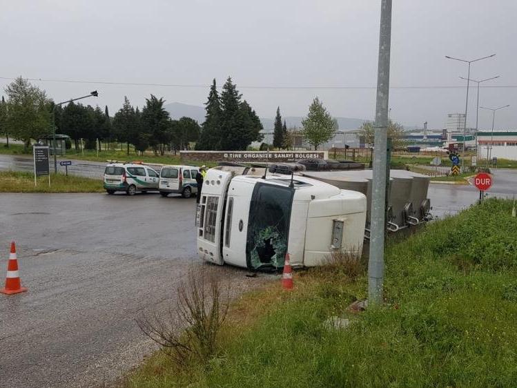 İzmir'in Tire ilçesinde meydana gelen trafik kazasında, yağış sebebiyle kayganlaşan yolda kontrolden çıkan bir süt tankeri devrildi. Sürücü, yaralı olarak hastaneye kaldırıldı.