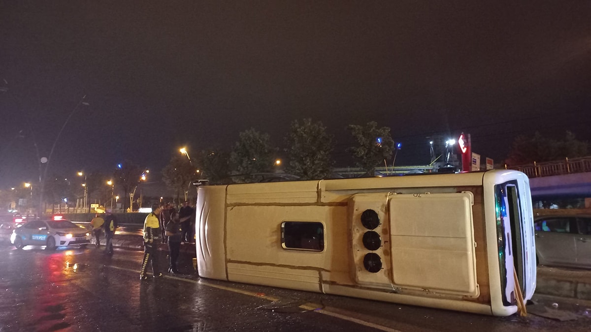 Kayseri'de M.E. yönetimindeki 38 P 2294 plakalı midibüs, Osman Kavuncu Bulvarı'nda yağış nedeniyle kayganlaşan yolda kontrolden çıkarak devrildi.