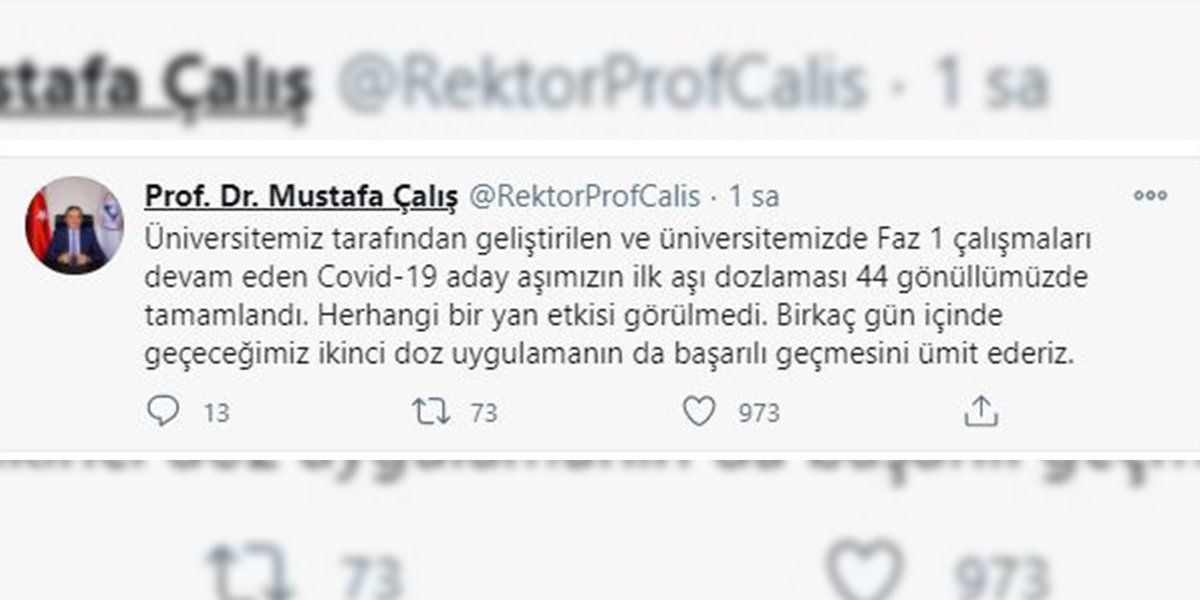 “Üniversitemiz tarafından geliştirilen ve üniversitemizde Faz 1 çalışmaları devam eden Covid-19 aday aşımızın ilk aşı dozlaması 44 gönüllümüzde tamamlandı. Herhangi bir yan etkisi görülmedi. Birkaç gün içinde geçeceğimiz ikinci doz uygulamanın da başarılı geçmesini ümit ederiz.”