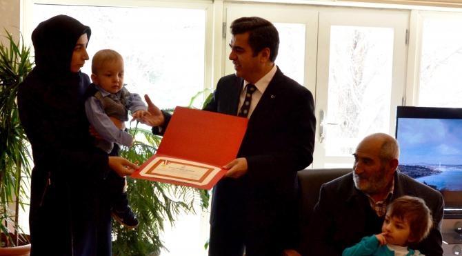 Vali Düzgün, makamında Kayseri’nin son şehidi Musa Yüce’nin eşi Hatice Yüce, çocukları Muhammed Ali ve Zehra, babası Halis Duran Yüce, kardeşleri Adem ve Seyit Yüce ile bir araya geldi. 4 Ocak’ta hain bir saldırıcı sonucu şehit olan ve 5 Ocak’ta Bünyan Büyüktuzhisar Mahallesi’nde dualarla son yolculuğuna uğurlanan Musa Yüce için bir kez daha başsağlığı dileyen Vali Düzgün, bu cennet vatanın birliği, dirliği ve geleceği için canını feda eden şehitlerin emanetleri için ne yapılsa az olduğunu söyledi. Cumhurbaşkanı Recep Tayyip Erdoğan’ın talimatları doğrultusunda şehidin ailesine konut tahsis edildiğini belirten Vali Düzgün, şehidin emaneti olan ailelerinin devlet olarak her zaman yanlarında olduklarını vurguladı. Vali Düzgün, şehidin çocukları Zehra ve Muhammed Ali adına düzenlenmiş olan `Konut Tahsis Belgesi`ni şehidin eşi Hatice Yüce’ye verdi.