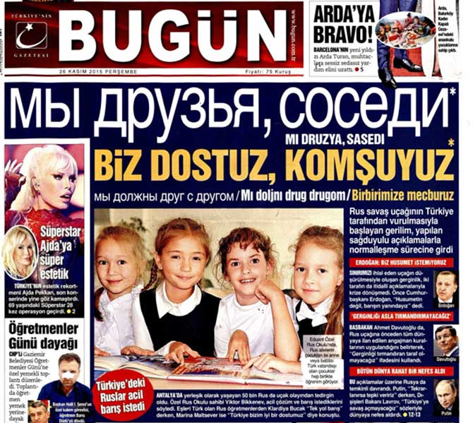 AKP iktidarına muhalifliğiyle bilinen cemaate yakın Bugün Gazetesi, geçtiğimiz ay kayyuma devredildi. Kayyum yönetimine geçtiği günden itibaren de hükümeti desteklemeye başladı. Bugün Gazetesi, Rus uçağının düşürülmesinin ardından ilginç bir manşet ile piyasaya çıktı. Manşetinde Rusça kril alfabesiyle “Biz dostuz, komşuyuz “ ifadeleri yer aldı.