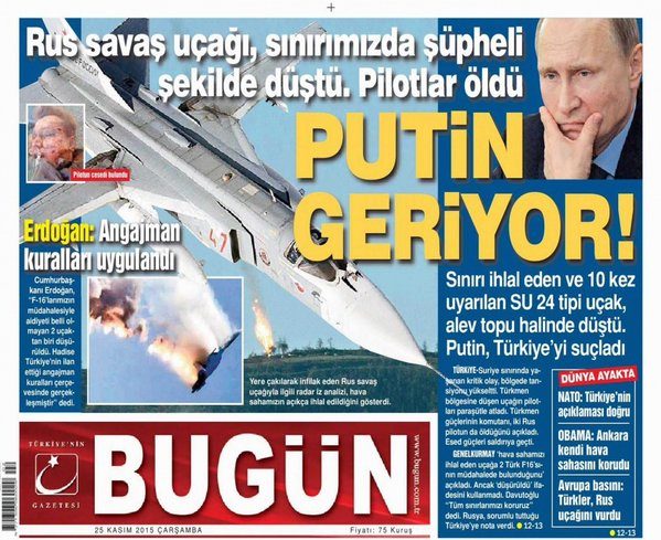 Haberde, “Rus Savaş uçağının Türkiye tarafından vurulmasıyla başlayan gerilim, yapılan sağduyulu açıklamalarla normalleşme sürecine girdi” ifadeleri yer aldı. Ancak aynı gazete bir gün önce sert bir manşet atmış, “Putin geriyor” başlıklı haberinde “Sınırı ihlal eden ve 10 kez uyarılan SU 24 tipi uçak, alev topu halinde düştü. Putin Türkiye’yi suçladı” ifadelerine yer vermişti.