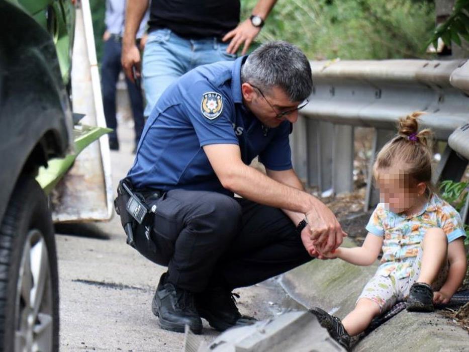 Bu esnada kazada yara almayan annesi ve iki kardeşi yaralanan 2 yaşlarındaki çocuğun hiçbir şeyden habersiz şekilde yol kenarına oturarak araçlardan savrulan parçalarla oynaması dikakt çekti. Bu esnada polisin memurunun da küçük kıza eşlik ederek sevgi göstermesi objektiflere takıldı. (İHA)