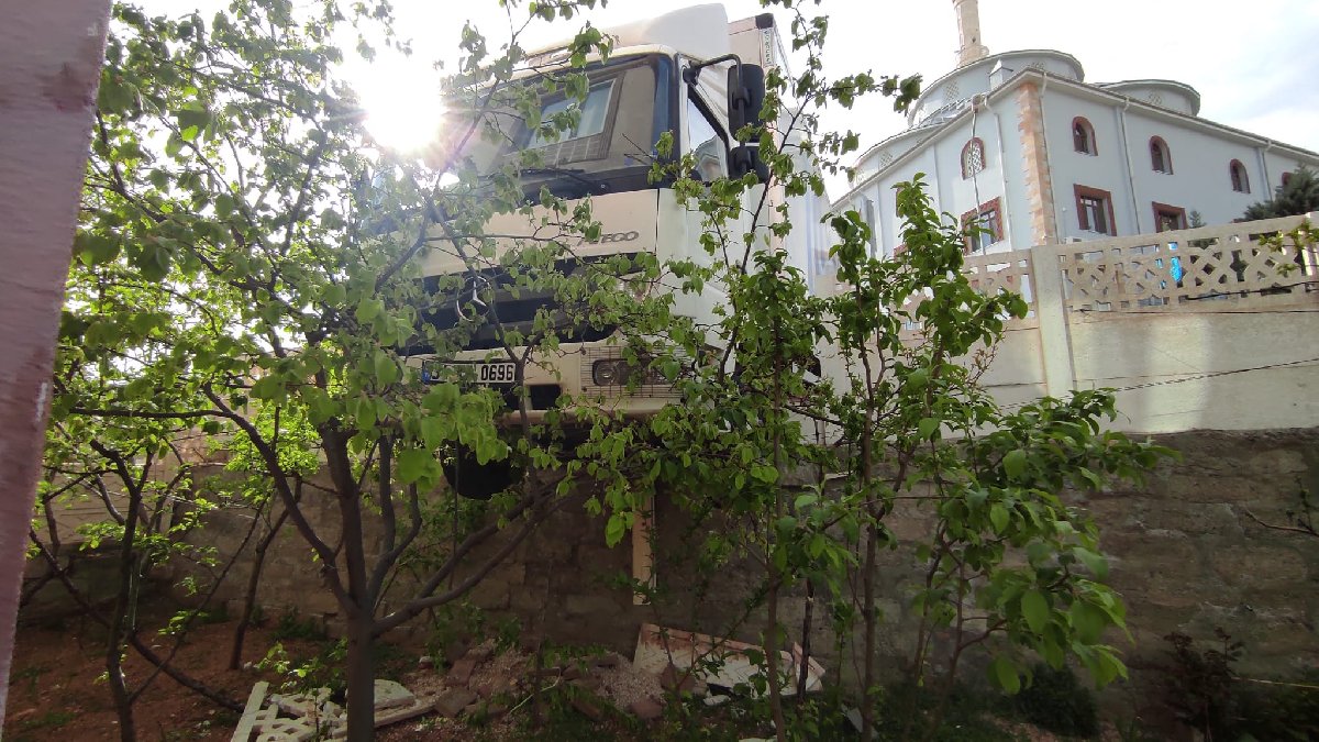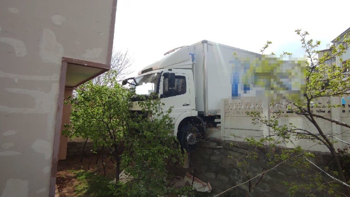 Sürücüsünün ismi öğrenilemeyen 34 KL 0696 plakalı market malzemesi yüklü kamyon, iddiaya göre freni boşalınca kontrolden çıkıp sokağın sonundaki evin bahçe duvarını yıkarak askıda kaldı.