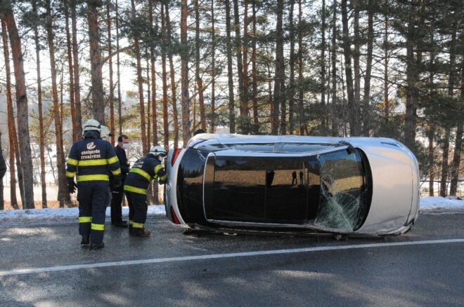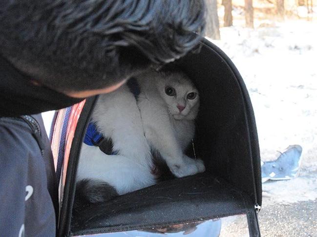 (FOTO: DHA)Eskişehir'de Gülistan Acar'ın direksiyon hakimiyetini kaybettiği otomobil, yol ortasındaki elektrik direğine çarpıp takla attı. Araçtan hafif yaralı halde çıkarılan Acar'ın korkan kedisini, polis sakinleştirdi.