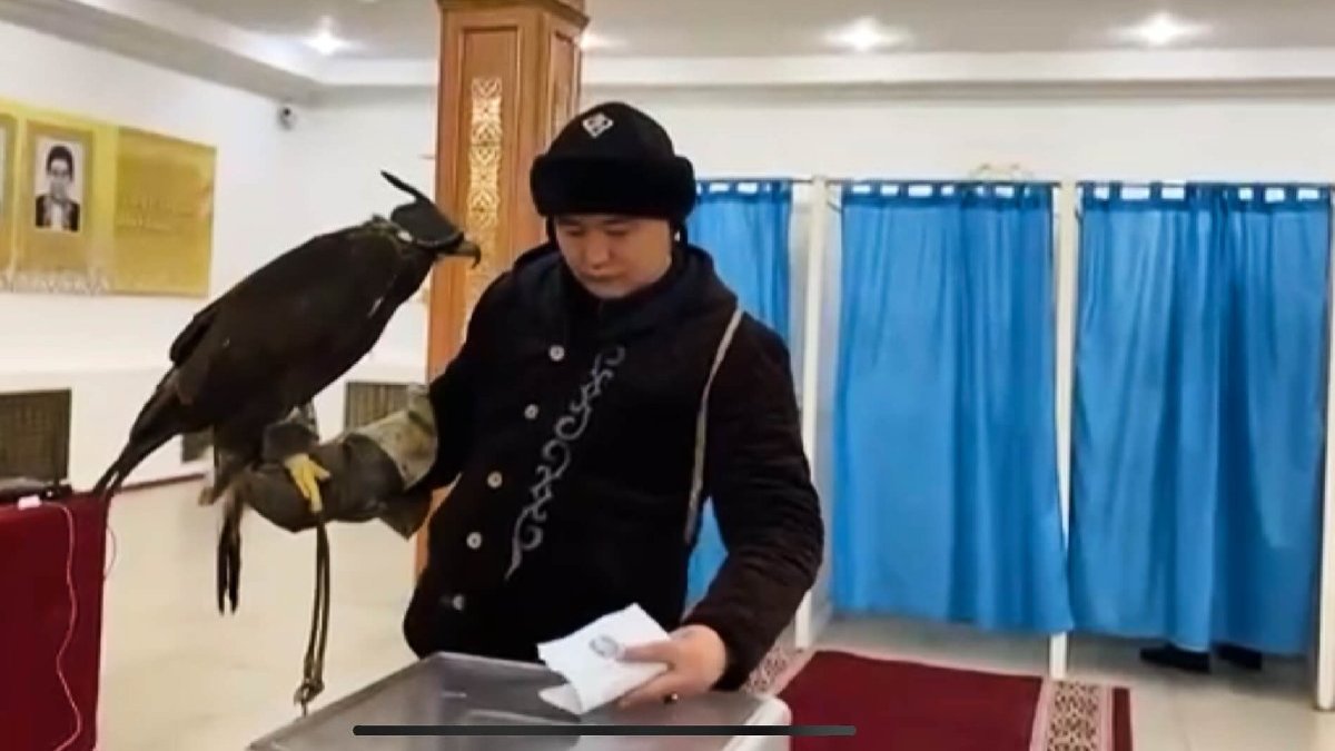 Kazakistan’ın doğu eyaleti Abay eyaletinin merkezi Ayagöz kentinde yaşayan bir kartal avcısı, oyunu kullanmak için sandık başına geleneksel avcı kıyafeti ve kartalıyla gitti.