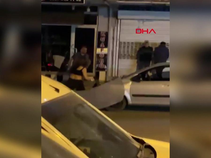 Otomobilini yumruklayarak hasar gören parçaları çıkarmaya çalışan kadın, çevredekilerce cep telefonu kamerasıyla kaydedildi. (AA)
