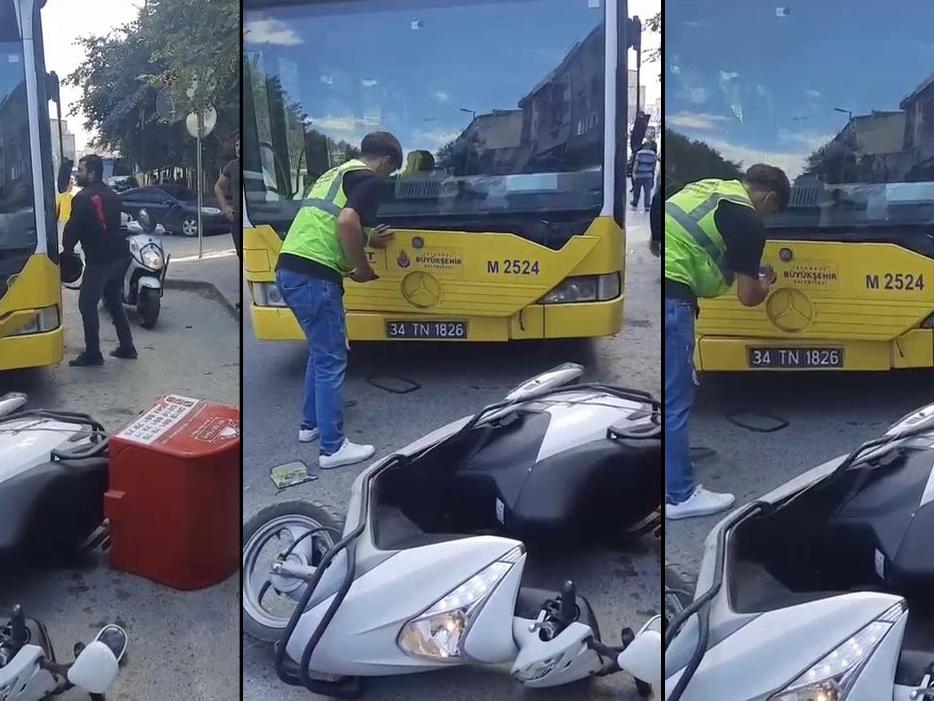 İstanbul Esenyurt’ta bir motokurye, motosikletine İETT otobüsünün çarpması ile deliye döndü. Arkadaşını da çağıran motokurye, otobüsü tekmeleyip şoföre küfür etti.