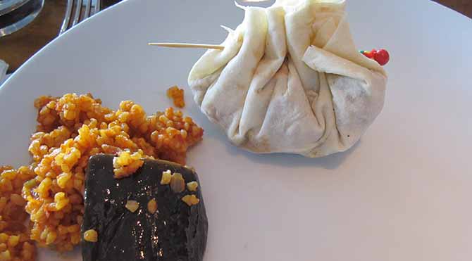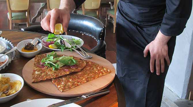 Arkadaşım benim yemeğe olan düşkünlüğümü bildiği için şefe bir mesaj yolluyor, iddialı olan ne varsa gelsin diye. Yani benim tam sevdiğim gibi. Önce ortaya bol zahter ile yapılmış oldukça lezzetli tablaca salatası geliyor, daha sonra da nar ekşisi tam kıvamında zahter salatası ve yemeğe doyamadığım muammara. Muammara bildiğiniz gibi ceviz, salça, ekmek kırıntısı ve tam kıvamında baharatlarıyla yapılırsa çok severim. Lavaş ekmeğine doldurur, doldurur yerim. Başlangıçlar bitti derken patlıcan dolması ve şef Ahmet Yıldırım’ın bizzat elleriyle hazırlayıp servis ettiği lahmacunlar geliyor ama esas büyük sürpriz arkadan gelen bohça gibi yufkaya sarılmış çöp şiş oluyor çok değişik ve güzel bir sunum oluyor. Hele yanına koydukları patlıcanlı pilav ile tam bir lezzet bombasına dönüşüyor. Burada bitti tamamen doyduk derken masamıza gelen mekanın sahibesi Ayşegül Hanım’ın önerisiyle fıstıklı kebap ve terbiyeli şişi de tadıyoruz. Hepsi birbirinden lezzetli.