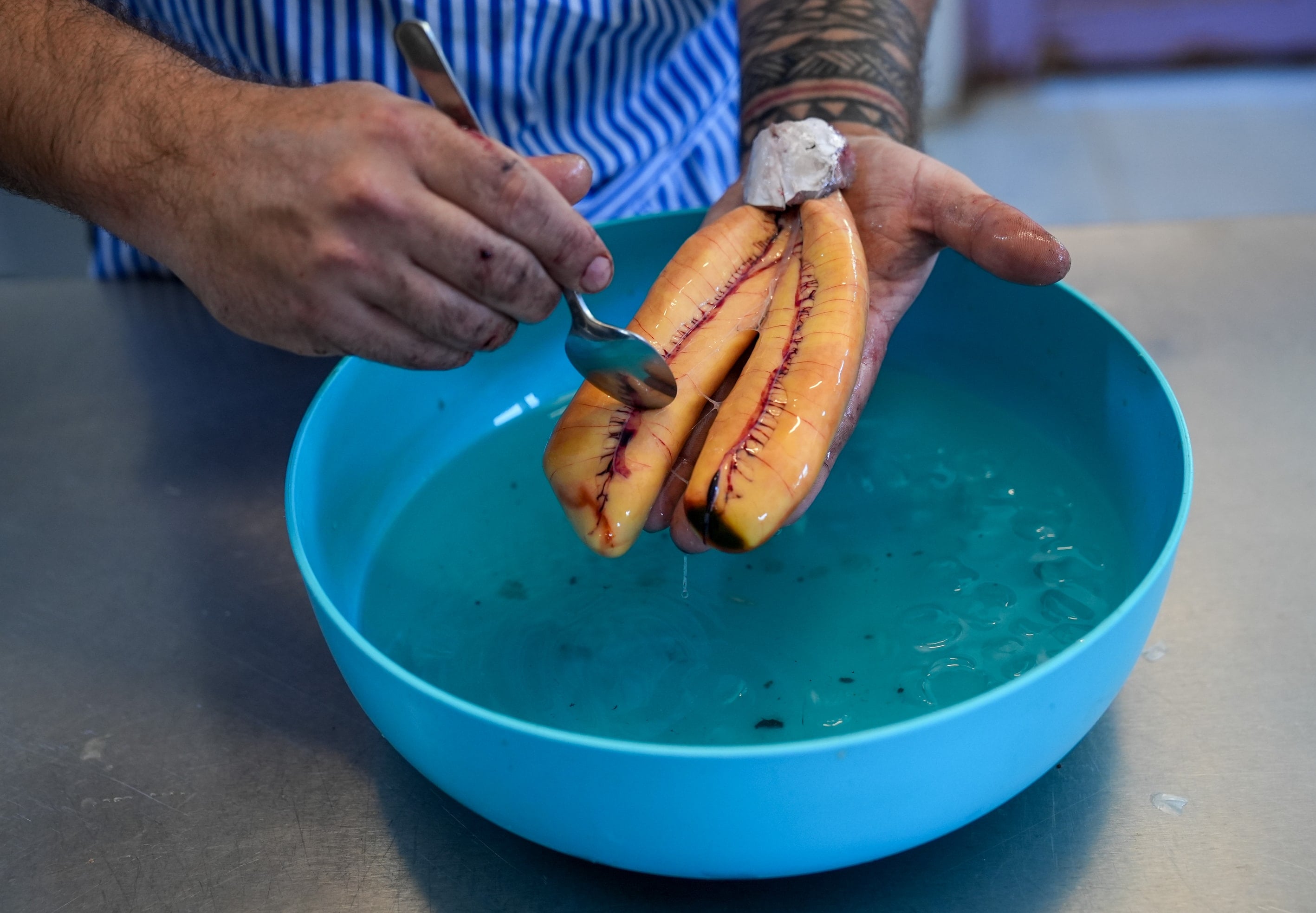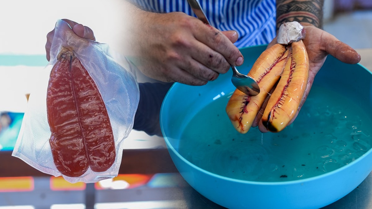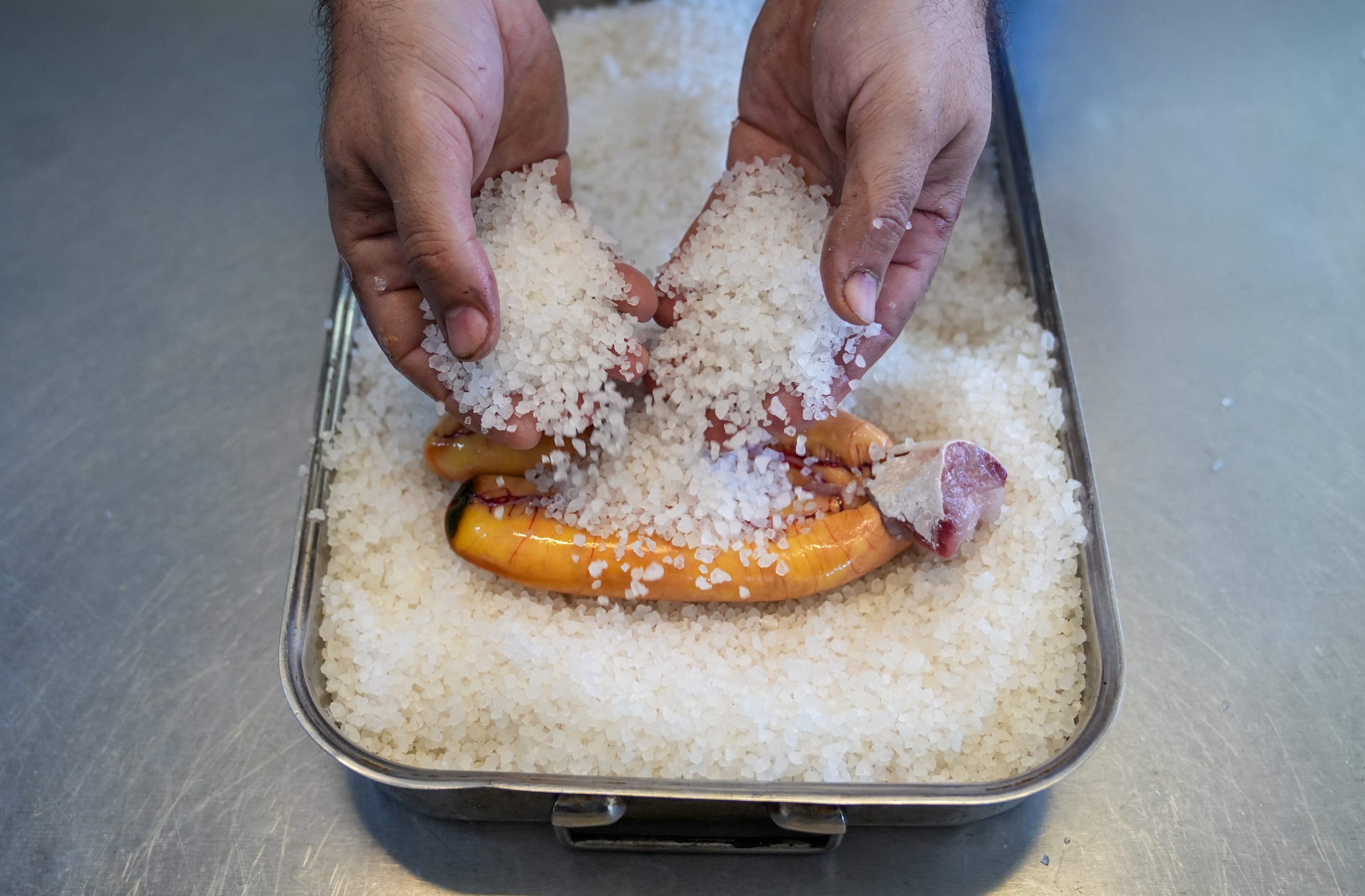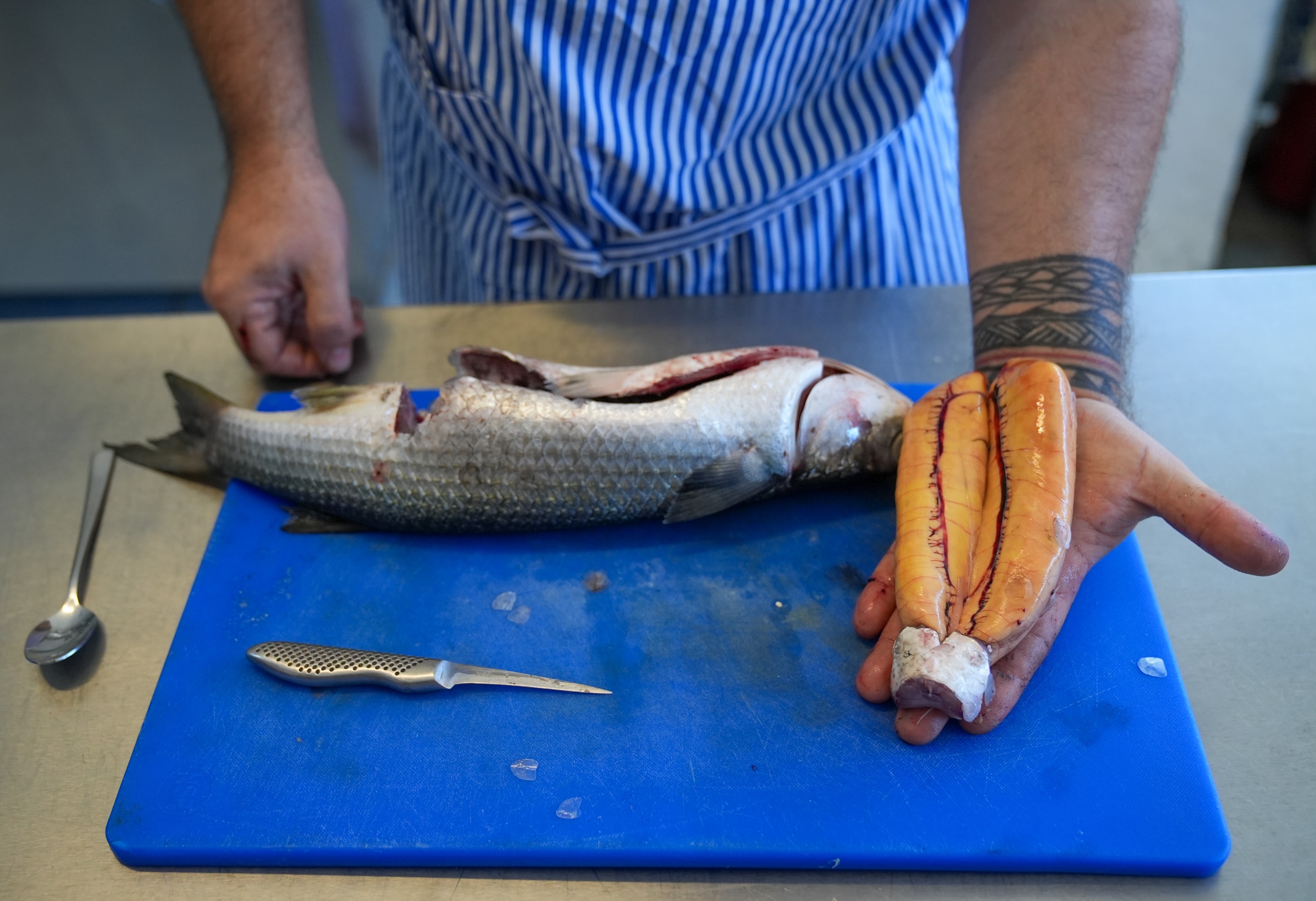 Şef Okan İlgüz, bottarga için önce dişi topan kefalinin yumurta kesesinin özenle çıkarılarak tuzla kaplandığını anlattı.