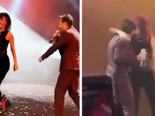 Öte yandan Saat'in sahneden inmeden önce eşiyle öpüşmesi de dikkat çekti.