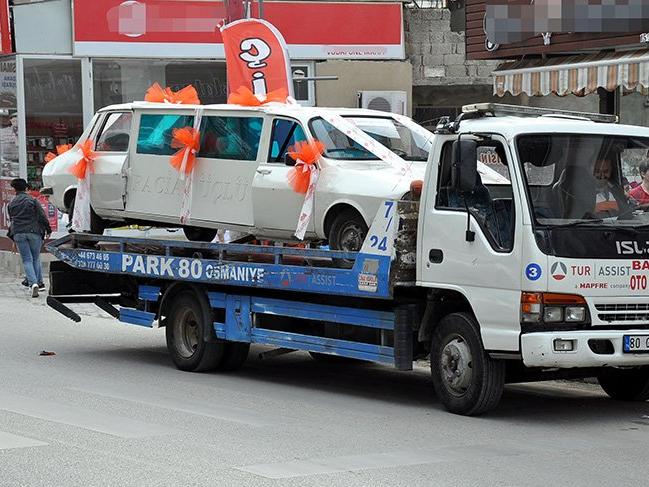 Gelin ve damat da çekici üzerindeki araca binere düğünün yapılacağı alana geldiBir hayalinin gerçek olduğunu belirten Mami Emen, "Düğün günü kiralayacağımız bir limuzin bulamadık. Gerçi çok pahalıydı kiralama fiyatları. 3 bin 500 TL’ye toros otomobili aldık. Arkadaşım Sefa Kındır ile birlikte sanayide otomobili bu şekilde limuzine çevirdik. Çekicinin üzerinde böyle bir arabada ilk defa bir gelin gidecek” dedi.