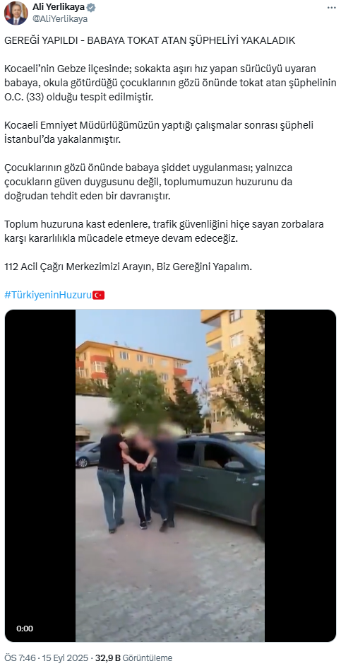 "Kocaeli ilimizin Gebze ilçesindeki bir sokakta aşırı hız yapan sürücüyü uyaran vatandaşımızın, okula götürdüğü çocukların gözü önünde fiziki saldırıya uğramasıyla ilgili Gebze Cumhuriyet Başsavcılığınca adli soruşturma başlatılmıştır. Soruşturma kapsamında şüpheli sürücü hakkında gözaltı talimatı verilmiştir."