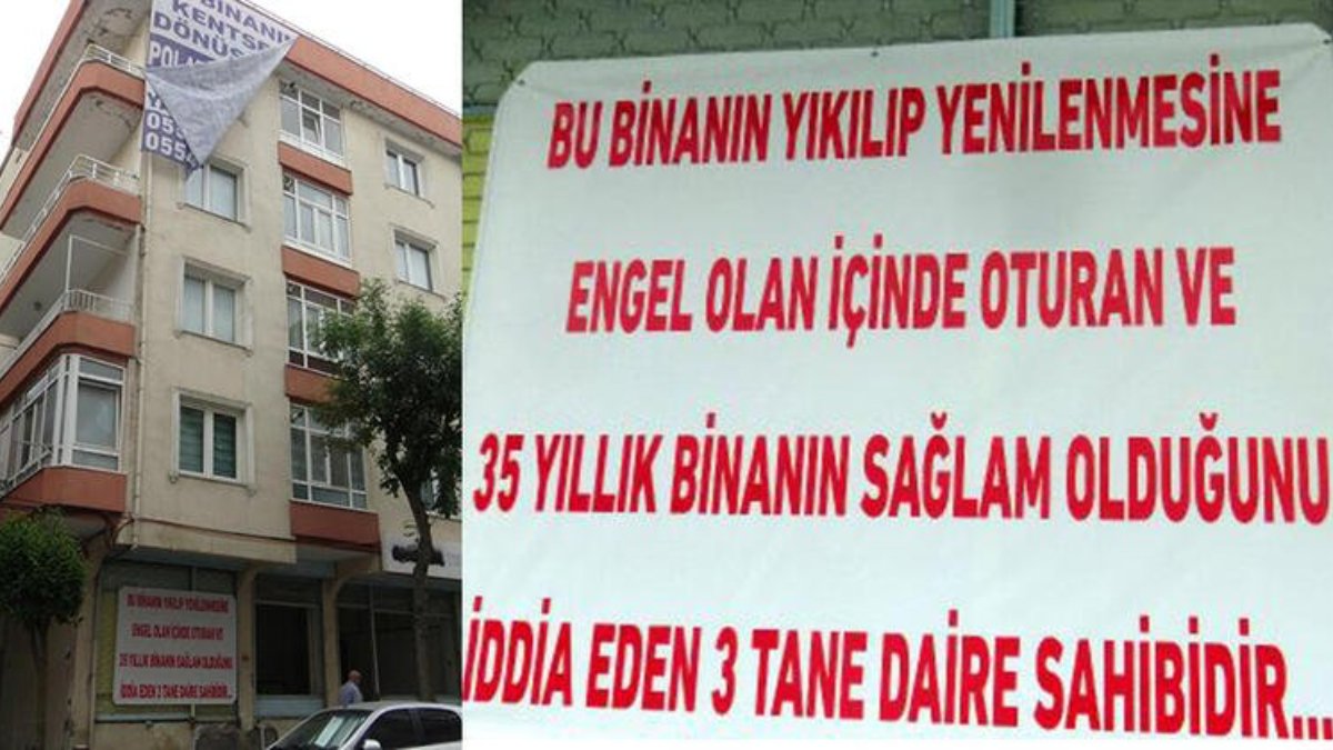 Bunun üzerine bina sakinleri, dükkanların bulunduğu bölüme “Bu binanın yıkılıp yenilenmesine engel olan içinde oturan ve 35 yıllık sağlam olduğunu iddia eden 3 daire sahibidir" yazılı pankart astı.