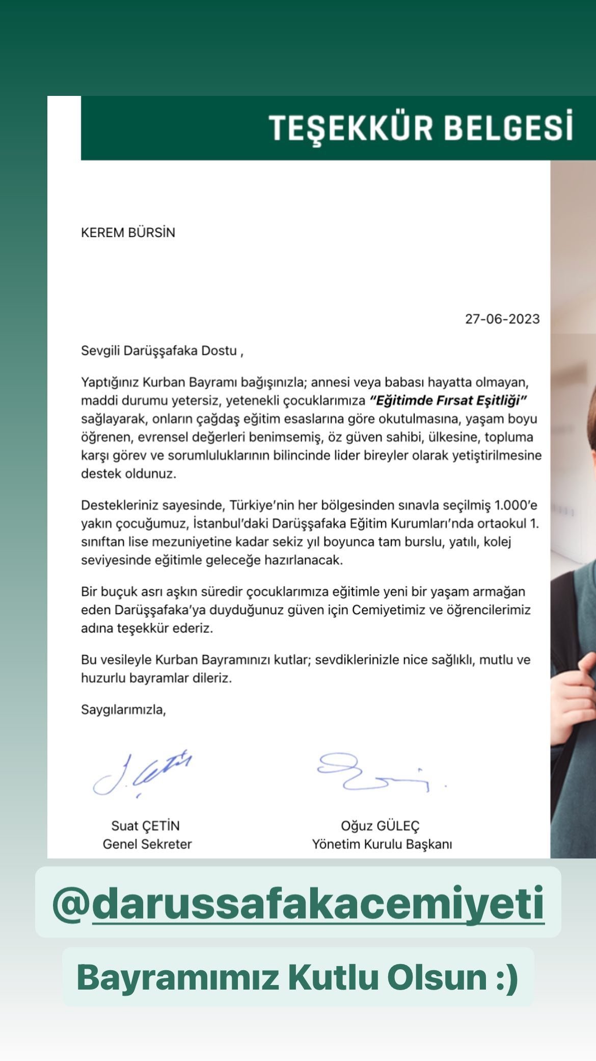 Oyuncu Kerem Bürsin’in Darüşşafaka Cemiyeti’ne yaptığı bağışla öğrencilerin eğitimine destek olacak. Bürsin, Darüşşafaka tarafından yayınlanan teşekkür belgesini Instagram hesabından “Bayramımız kutlu olsun” notuyla paylaştı.