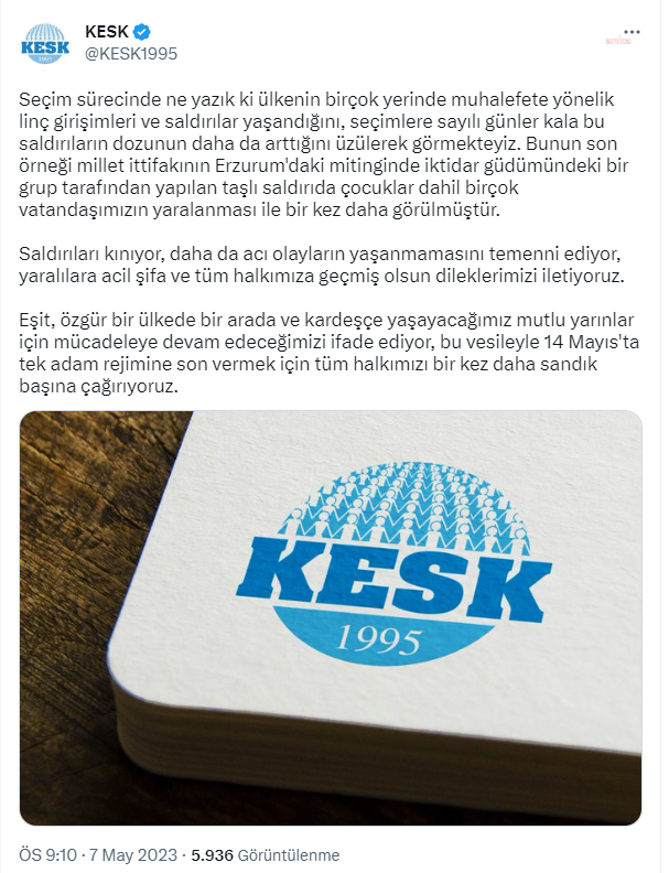 * Seçim sürecinde ne yazık ki ülkenin birçok yerinde muhalefete yönelik linç girişimleri ve saldırılar yaşandığını, seçimlere sayılı günler kala bu saldırıların dozunun daha da arttığını üzülerek görmekteyiz.