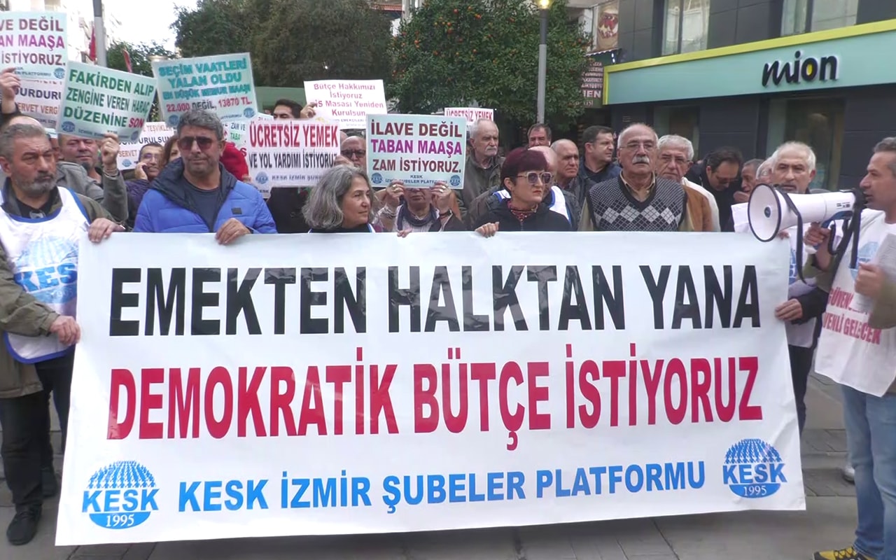 Kamu Emekçileri Sendikaları Konfederasyonu (KESK) İzmir Şubeler Platformu, ‘Emekten yana, demokratik halk bütçesi istiyoruz’ talebiyle Alsancak Halk Bank önünde bir araya geldi. Hükümetin hazırladığı 2024 bütçesini protesto eden KESK üyeleri, bütçe taleplerini sıraladı.