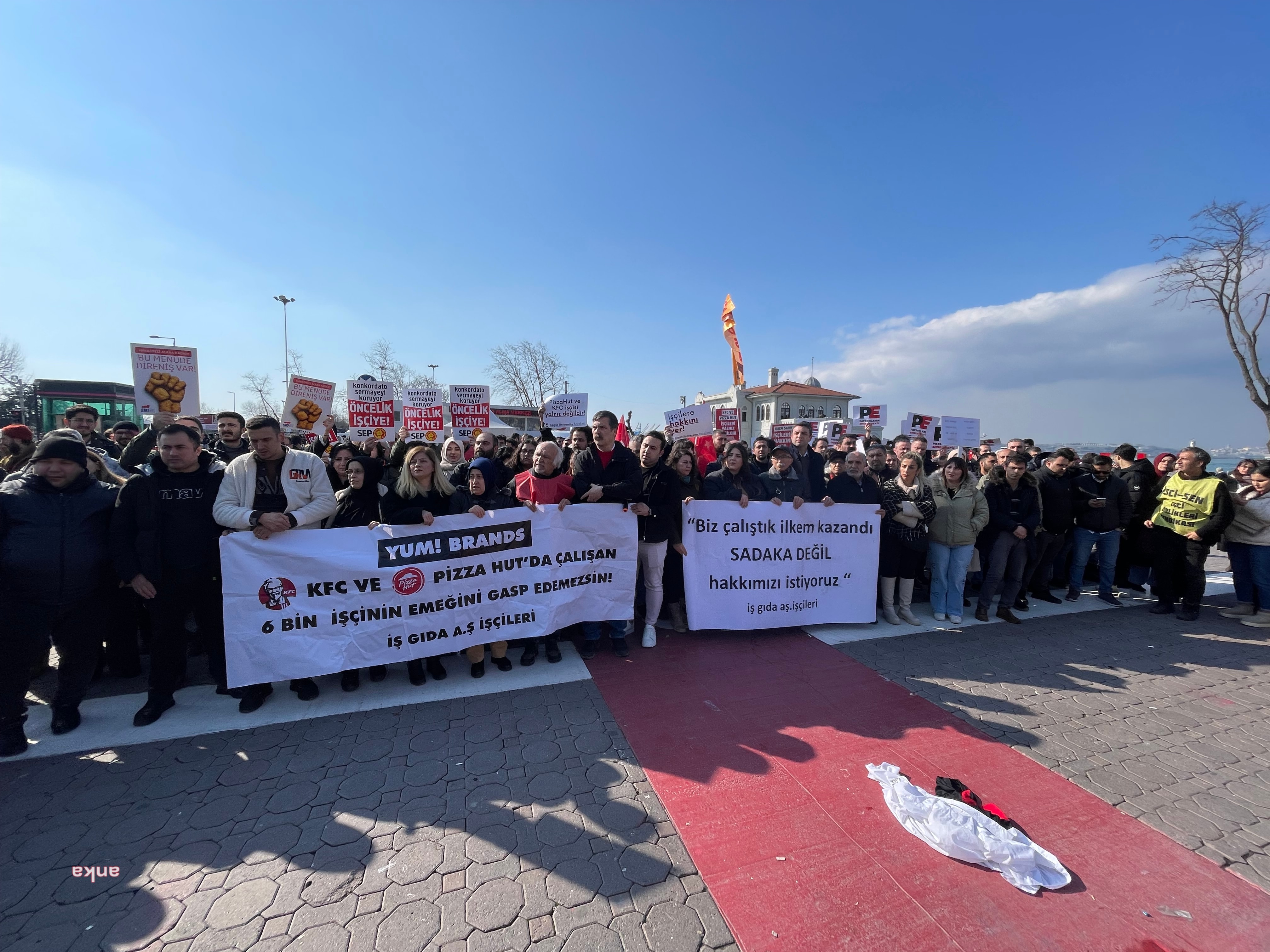 İş Gıda'nın konkordato ilanı sonrasında, Türkiye'de faaliyet gösteren binlerce KFC ve Pizza Hut çalışanı işsiz kaldı. Eyleme katılan emekçiler, maaşlarını ve haklarını alamadıklarını belirterek haklarını talep etti. "Sadaka değil hakkımızı istiyoruz" ve "Yum Brands KFC ve Pizza Hut’ta çalışan 6 bin işçinin emeğini gasp edemezsin" yazılı pankartlar taşıyan işçiler, "Hak hukuk adalet", "İşçiler sokakta İlker Şahin nerede", "Sefalete teslim olmayacağız", "Bu daha başlangıç mücadeleye devam" gibi sloganlarla seslerini duyurdu.