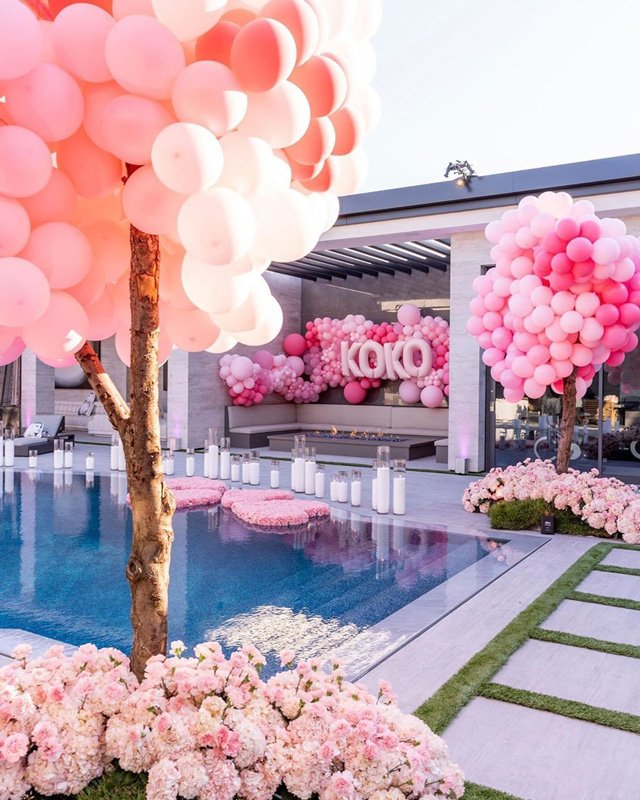 Kızıyla bir örnek giyinen Kardashian, Los Angeles'taki evini pembe rengin hakim olduğu objelerle dekore etti. Devasa bir kaydırağın da bulunduğu partide ayrıca havuzda köpükler, pembe kurabiyeler, pembe pasta ve kendisine kısaca hitap edildiği gibi “Koko” adının yazıldığı panolardan oluşan süslemeler de vardı.