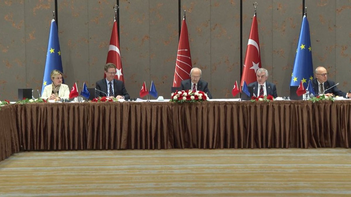 AB Türkiye Delegasyonu Başkanı Nikolaus Meyer Landrut’un da katıldığı yemekte CHP lideri Kılıçdaroğlu’na CHP Genel Sekreteri Selin Sayek Böke, Genel Başkan Yardımcısı ve Parti Sözcüsü Faik Öztrak, Genel Başkan Başdanışmanı Ünal Çeviköz, Kadın Kolları Genel Başkanı Aylin Nazlıaka ile AB Uyum Komisyonu Üyesi Milletvekilleri Özkan Yalım, Türabi Kayan, Nurhayat Altaca Kayışoğlu ve Sibel Özdemir eşlik etti.