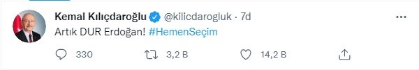 Merkez Bankası politika faizini 100 baz puan indirerek yüzde 16’dan yüzde 15’e indirdi. Merkez Bankası'nın faiz kararının ardından sosyal medya hesabından paylaşım yapan CHP lideri Kemal Kılıçdaroğlu, Cumhurbaşkanı ve AKP Genel Başkanı Erdoğan'a seslenerek "Artık dur Erdoğan! #HemenSeçim" paylaşımında bulundu.