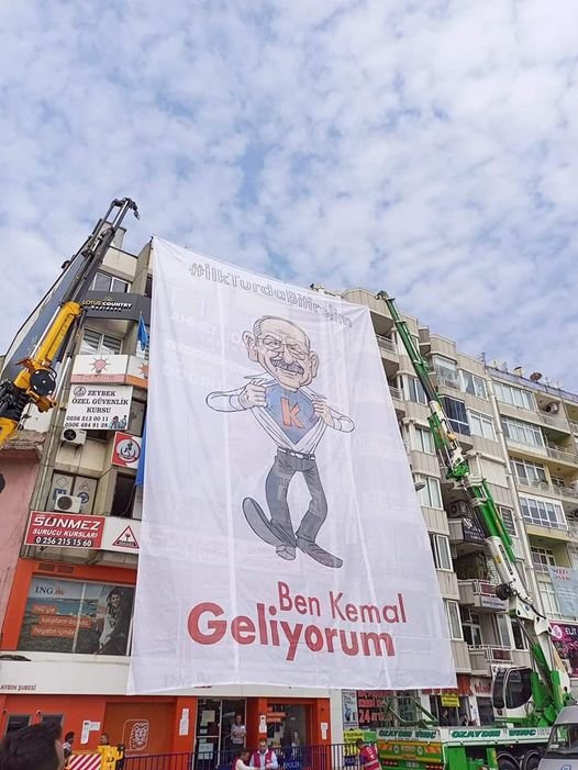 Meydana hakim bir alana asılan ve Kemal Kılıçdaroğlu’nun ‘Süperman’ olarak çizildiği karikatürlü afişte “Ben Kemal geliyorum” ve  Kılıçdaroğlu’nun seçim sürecinde sıklıkla vurguladığı ‘İlk turda bitirelim’ etiketi ifadesine yer verildi.