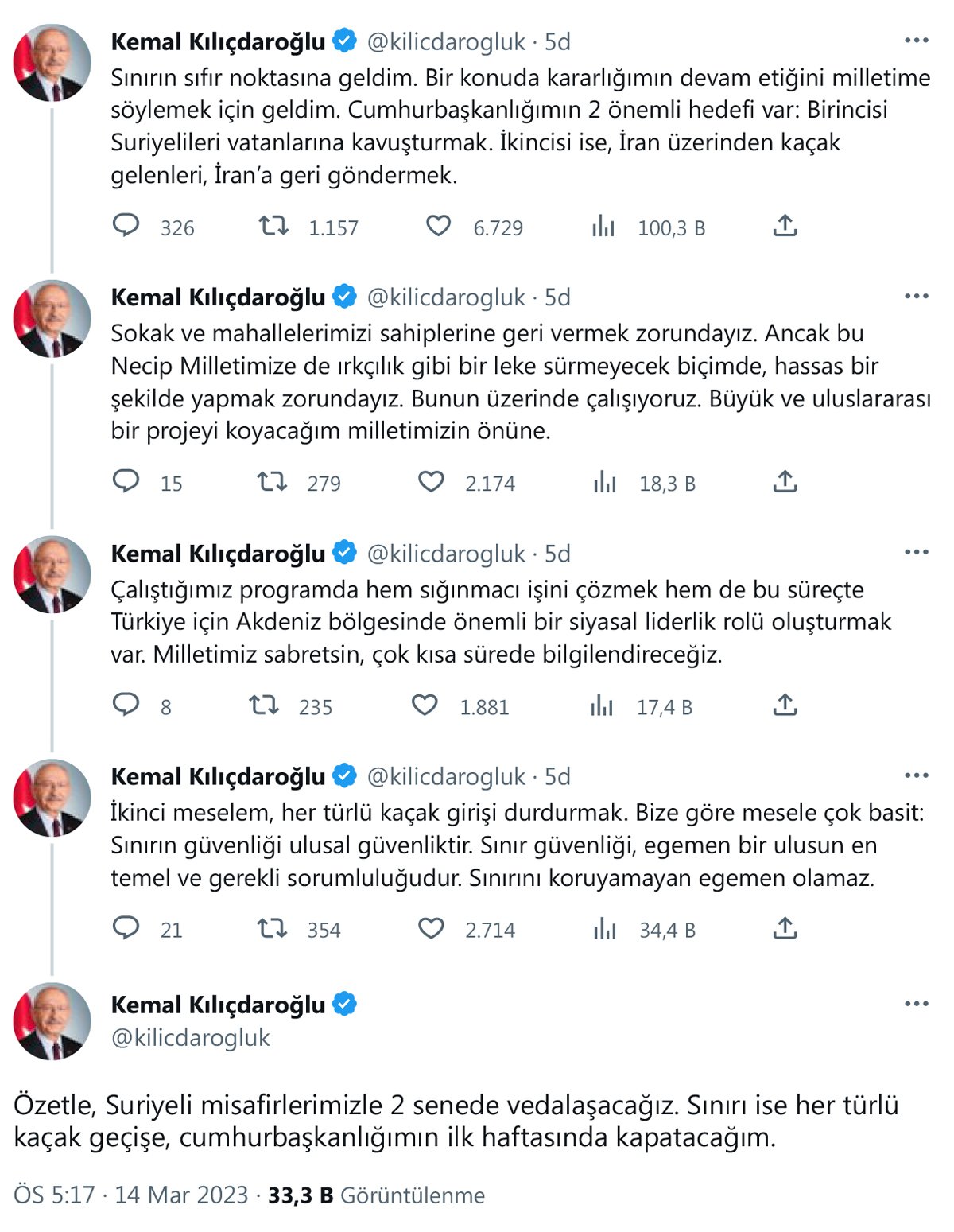 Paylaşımlarında "Cumhurbaşkanlığımın 2 önemli hedefi var: Birincisi Suriyelileri vatanlarına kavuşturmak. İkincisi ise, İran üzerinden kaçak gelenleri, İran’a geri göndermek" diyen Kılıçdaroğlu, şu ifadeleri kullandı: