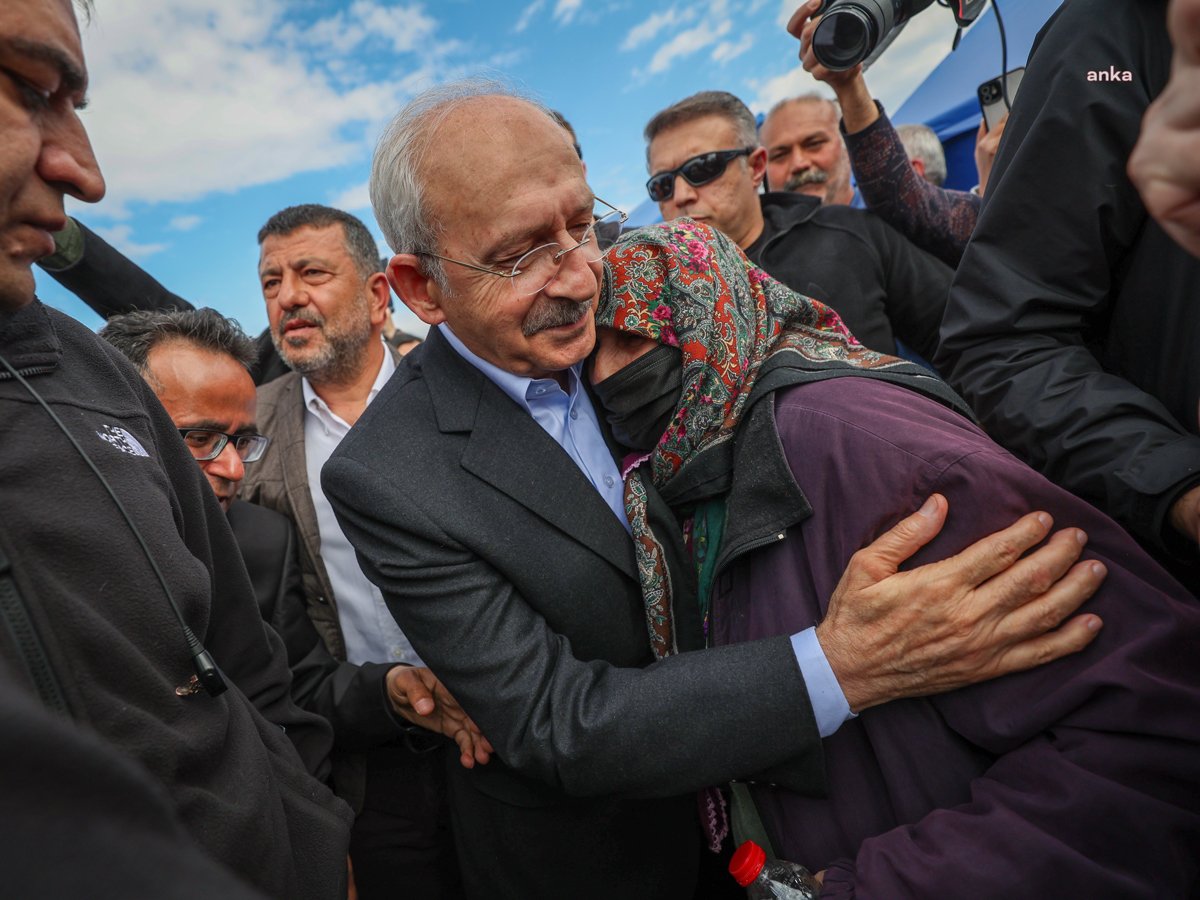 Depremden etkilenen bir kadın yurttaş, Kılıçdaroğlu’na, “Ben seni gece rüyamda gördüm” deyip elini öpmek istedi. Kılıçdaroğlu da yurttaşa, “Estağfurullah” dedi ve sarıldı. Kadın, Kılıçdaroğlu’na, “Oy kurban olayım sana” dedi.