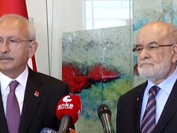 CHP Genel Başkanı Kemal Kılıçdaroğlu, CHP Genel Merkezi'nde Saadet Partisi Genel Başkanı Temel Karamollaoğlu ile bir araya geldi. İki lider görüşme sonrası ortak açıklama yaparak FETÖ borsası iddiaları ve Tamince'ye soruşturma açılmasına dair sorulara yanıt verdi.