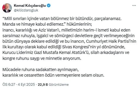 Manda ve himaye kabul edilemez.” hükümlerinin; inancı, kararlılığı ve Aziz Vatan’ı, milletimizin harim-i ismeti kabul eden sarsılmaz ruhuyla, işgalci ve sömürgeci devletlere geçit verilmeyeceğinin bütün dünyaya deklare edildiği ve bu inancın, Cumhuriyet Halk Partisi’nin ilk kurultayı olarak kabul edildiği Sivas Kongresi’nin yıl dönümünde, Kurucu Liderimiz Gazi Mustafa Kemal Atatürk’ü, silah arkadaşlarını ve kongre ruhunu saygı ve minnetle anıyorum.