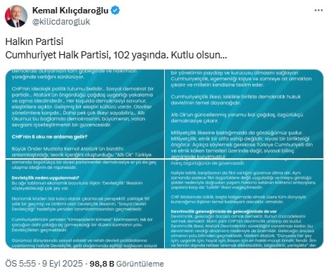 CHP'nin 7. Genel Başkanı Kemal Kılıçdaroğlu, CHP'nin kuruluşunun 102. yıl dönümünde sosyal medya hesabından paylaşım yaptı.