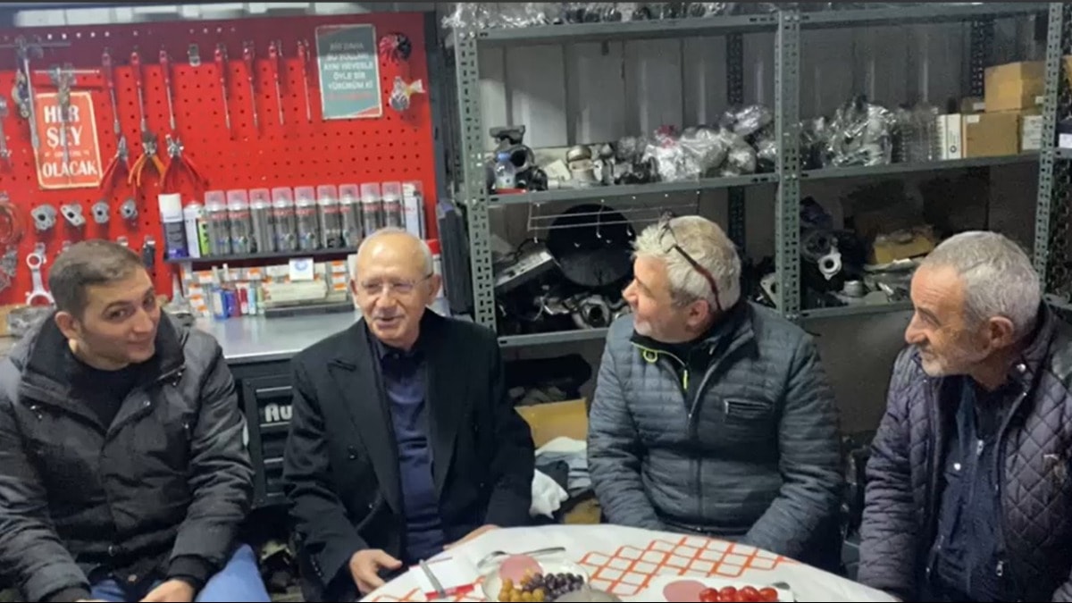 Oto tamircileri ve yedek parça satan esnafla sohbet eden Kılıçdaroğlu esnaflara simit götürürken, esnaflar da çay simit ve peynir ve domates ikram ettiler.