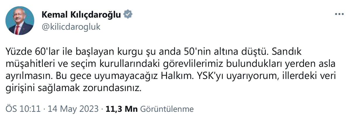 * Sandık müşahitleri ve seçim kurullarındaki görevlilerimiz bulundukları yerden asla ayrılmasın. Bu gece uyumayacağız Halkım.