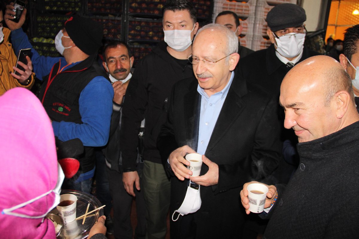 Halde yemek dükkanı bulunan esnafa da uğrayan Kemal Kılıçdaroğlu, "Bereketli kazançlar elde edin. Huzur içinde yaşamanızı, alın terinizin karşılığını almanızı istiyoruz" dedi. Kılıçdaroğlu, hal esnafı bir kadının ikram ettiği çayı da içti. CHP liderine İzmir Büyükşehir Belediye Başkanı Tunç Soyer, CHP İzmir İl Başkanı Deniz Yücel, ilçe belediye başkanları ve milletvekilleri de bulundu. (İHA)