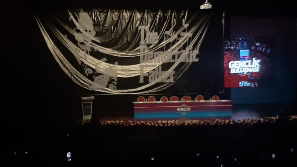 3 Oscarlı 1972 yapımı Baba (The Godfather) filminin afişine benzetilen dev pankartta, Kılıçdaroğlu’nun fotoğrafı orijinal film afişinde Marlon Brando gibi yer aldı. İtalyan Besteci Nino Rota’nın efsanevi film müziği ile birlikte açılan perdeden çıkan afişte ‘The Democratic Father’ (Demokratik Baba) ifadesi yer aldı.