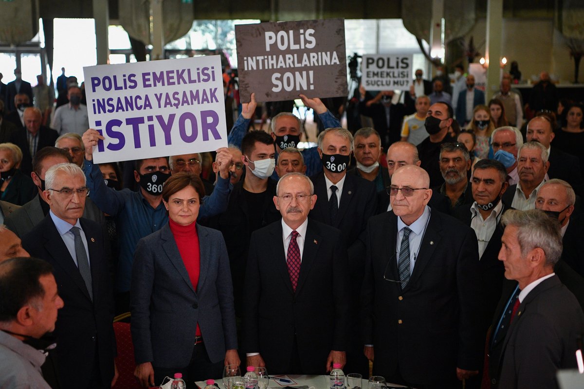 CHP Genel Başkanı Kemal Kılıçdaroğlu, İstanbul’da Haliç Kongre Merkezi’nde emekli emniyet mensupları ile bir araya geldi. Konuşmalardan önce “Polis emeklisi insanca yaşamak istiyor”, “Polis intiharlarına son”, “Zam değil 3600 ek gösterge verilsin” dövizleri açıldı.
