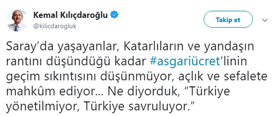 * Saray’da yaşayanlar, Katarlıların ve yandaşın rantını düşündüğü kadar #asgariücret’linin geçim sıkıntısını düşünmüyor, açlık ve sefalete mahkûm ediyor...