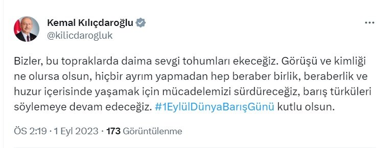 Kılıçdaroğlu, "Bizler, bu topraklarda daima sevgi tohumları ekeceğiz. Görüşü ve kimliği ne olursa olsun, hiçbir ayrım yapmadan hep beraber birlik, beraberlik ve huzur içerisinde yaşamak için mücadelemizi sürdüreceğiz, barış türküleri söylemeye devam edeceğiz. 1 Eylül Dünya Barış Günü kutlu olsun" ifadelerini kullandı.