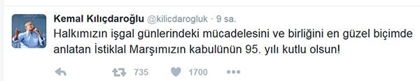 CHP Genel Başkanı Kemal Kılıçdaroğlu, Twitter hesabından yaptığı açıklamada, “Halkımızın işgal günlerindeki mücadelesini ve birliğini en güzel biçimde anlatan İstiklal Marşımızın kabulünün 95. yılı kutlu olsun!” ifadelerini kullandı