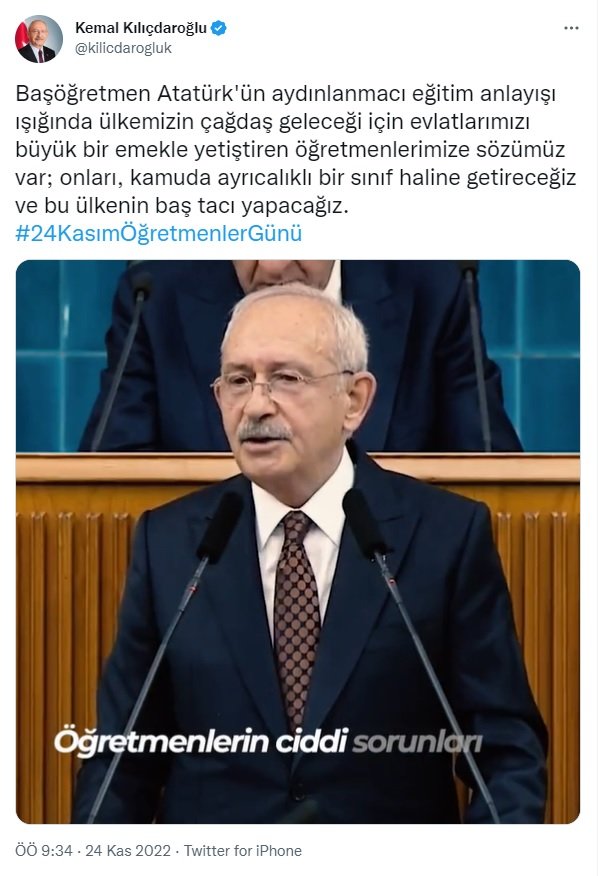 Partisinin grup toplantısında yaptığı konuşmasından bir kesit paylaşan Kılıçdaroğlu, "Başöğretmen Atatürk'ün aydınlanmacı eğitim anlayışı ışığında ülkemizin çağdaş geleceği için evlatlarımızı büyük bir emekle yetiştiren öğretmenlerimize sözümüz var; onları, kamuda ayrıcalıklı bir sınıf haline getireceğiz ve bu ülkenin baş tacı yapacağız" ifadesini kullandı.