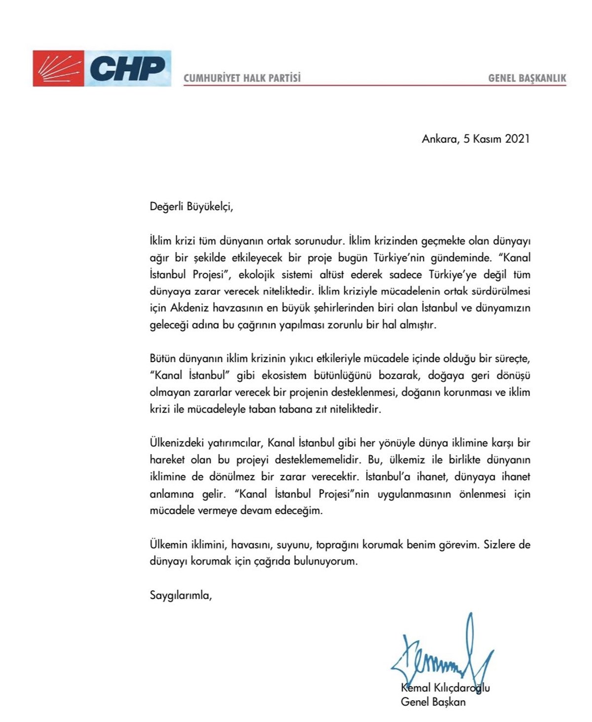 Kılıçdaroğlu, ilerleyen saatlerde Türkiye’de bulunan bütün büyükelçiliklere kendi dillerinde çağrı mektubu gönderdiğini duyurdu. Kılıçdaroğlu, “Suyumuz, toprağımız, doğamız bizim her şeyimizdir; yok edilmesine izin vermeyeceğim. Milletimin bilgisine sunarım” diyerek mektubu sosyal medya hesabından da paylaştı.