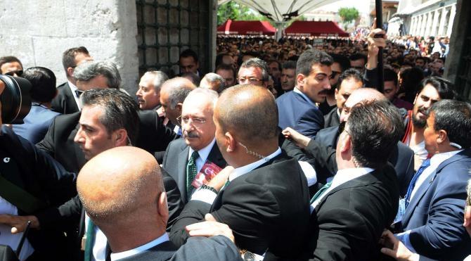 CHP Genel Başkanı Kemal Kılıçdaroğlu camiden çıkışı sırasında aynı grup tepki göstermeyi sürdürdü. CHP İstanbul Milletvekilleri Gürsel Tekin ve Enis Berberoğlu, CHP İstanbul İl Başkanı Cemal Canpolat ile koruma ekibinin cemberine aldığı Kılıçdaroğlu, uzaklaştırılmaya çalışıldı. CHP'liler de tepki gösteren kişilere karşılık verince uzun süren bir arbede yaşandı. Kılıçdaroğlu, tepkiler arasında aracına binerek camiden ayrıldı.