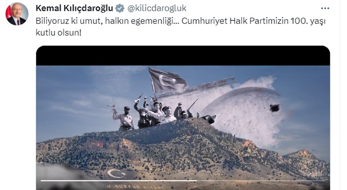 CHP lideri söz konusu videoyu "Biliyoruz ki umut, halkın egemenliği… Cumhuriyet Halk Partimizin 100. yaşı kutlu olsun!" notuyla paylaştı.